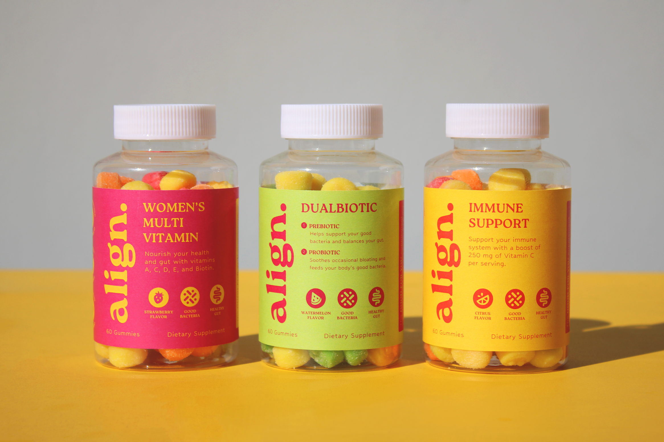 For my redesign, I designed and developed three flavors/variations of Align’s products. Starting with their iconic Dualbiotic gummies, I additionally designed women’s multivitamins and immune-boosting vitamins. Overall, my redesign stands out on the shelves because of their bright, eye-catching colors and fun personality, setting it apart from competitors.